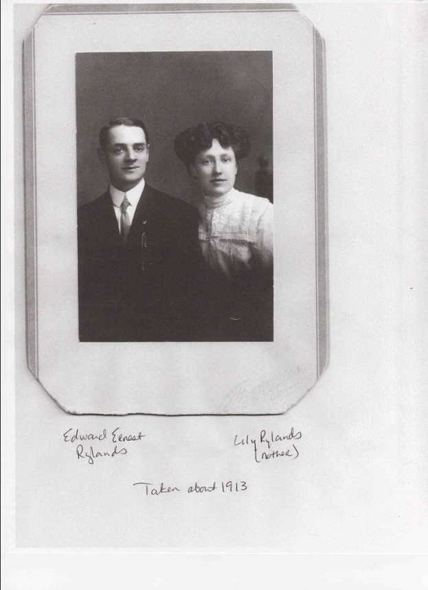Edward Ernest Rylands was born on 26 February 1886 to Josiah and Sarah Rylands; his father worked as a painter. Edward moved to the United States in 1910, soon settling in Denver, where two of his brothers also relocated. He traveled back to Liverpool in 1911, marrying Lily Nother (see photo; born 1887) and returning with her to America. The couple became parents of three children: Lily G. (1913-2012), Mildred F. (1916-2002), and (Edward A. (1929-2002).