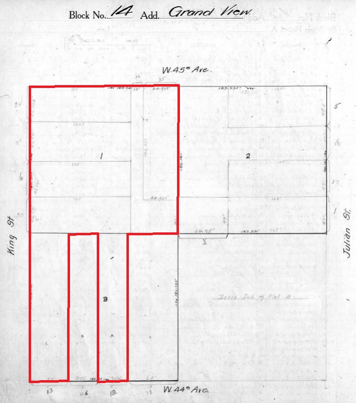 In 1919 Edward Rylands purchased a large piece of land comprising all of Lot 1 in Block 14 of Grand View, immediately north of his house. The following year, he made another acquisition that included portions of Lot 3 of the block, including his house (indicated in red on the plat below).